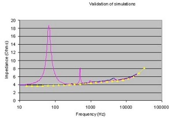 Following on from the above model, the FE results can be compared to the realised motor. The yellow trace shows the predicted performance. Overlaid, shown in pink and purple, is the measured terminal impedance of the realised design, with the voice coil free and clamped respectively.